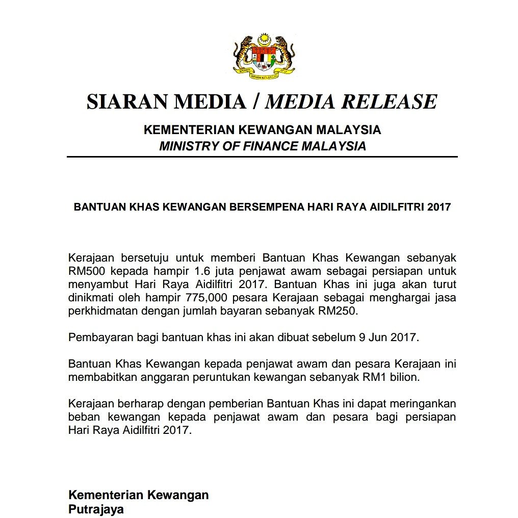 Bantuan Khas Kewangan Rm500 Untuk Penjawat Awam Sempena Raya 2017 Putrajaya Kementerian Kewangan Mala Around The Worlds Countries Around The World Malaysia