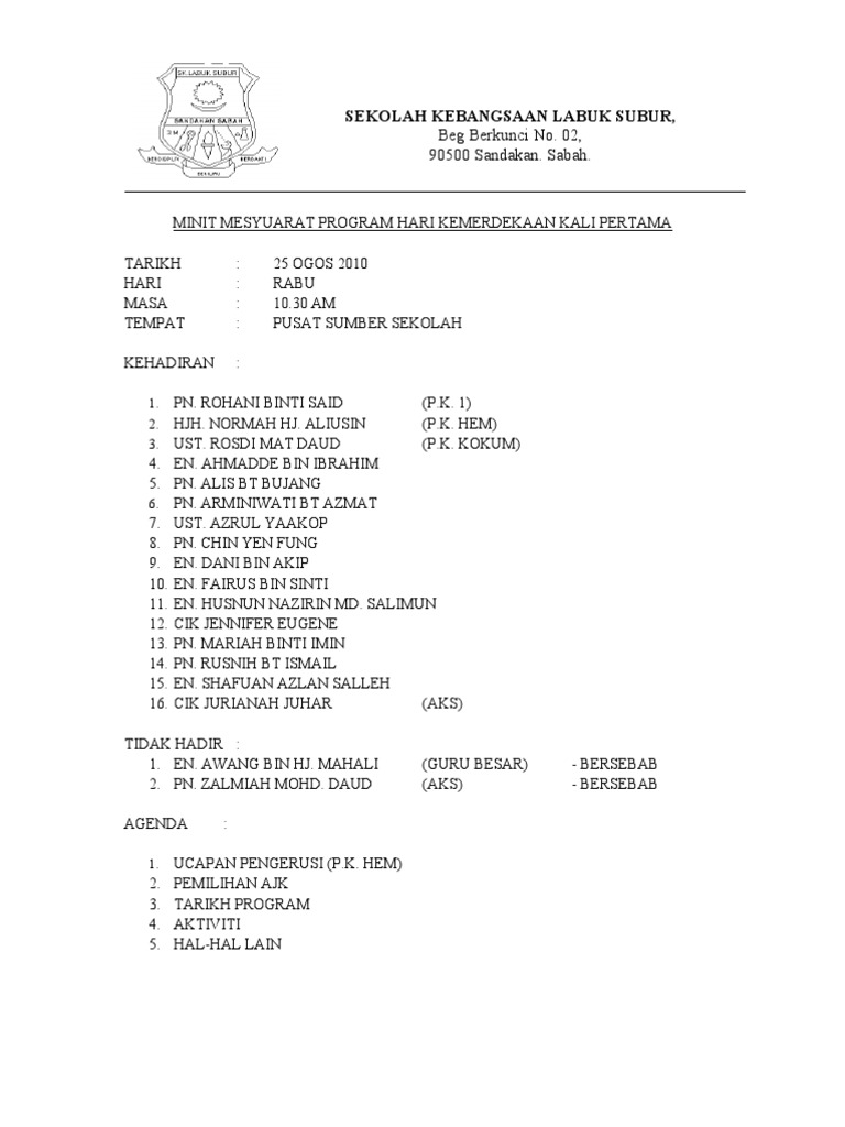 Contoh Minit Mesyuarat Sambutan Kemerdekaan