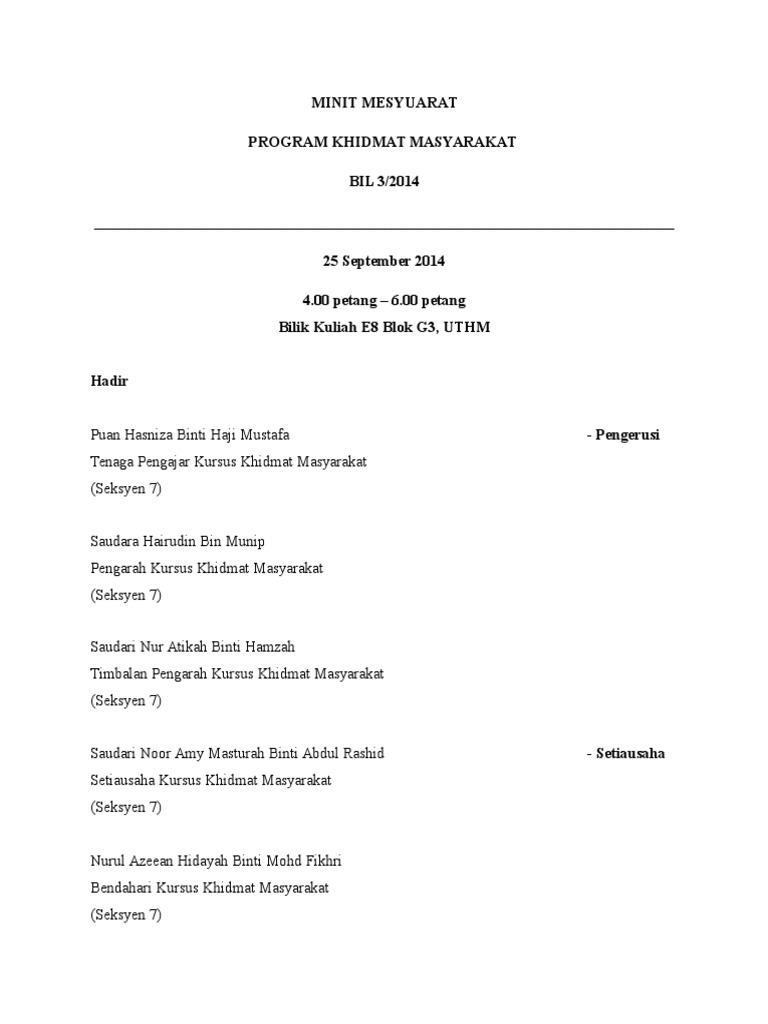 Contoh Minit Mesyuarat Program Khidmat Masyarakat Kertas