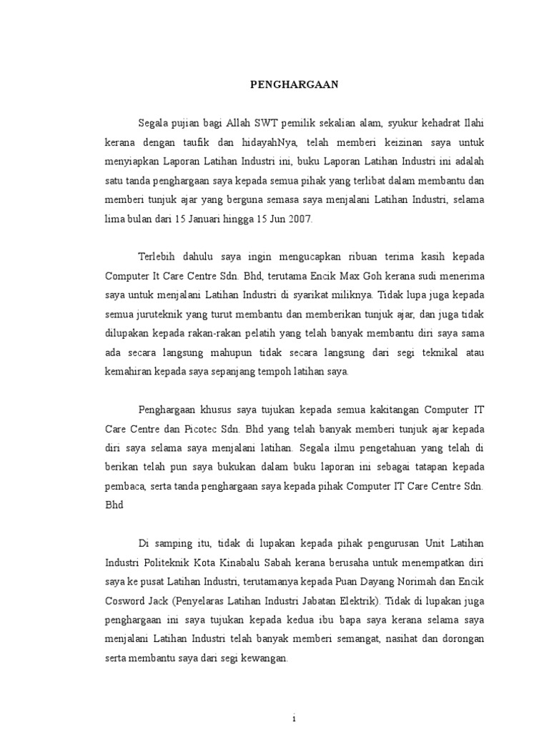 Contoh Penghargaan Laporan Latihan Industri