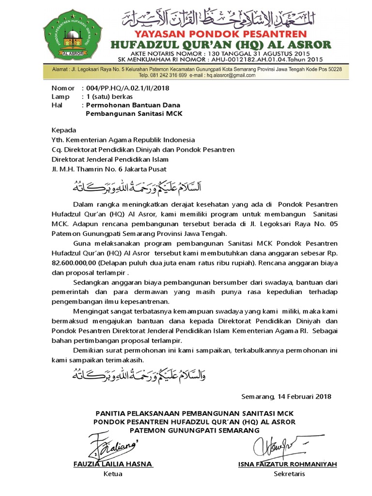 Contoh Surat Permohonan Bantuan Dana Pembangunan Pesantren
