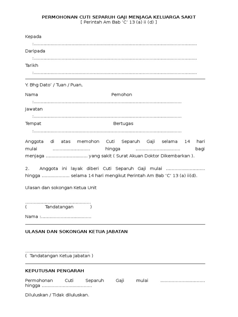 Cuti separuh gaji menjaga ibu sakit. Permohonan cuti separuh gaji menjaga keluarga sakit. Cuti separuh gaji bertujuan bagi menjaga sanak saudara yang rapat disebabkan oleh masalah kesihatan sahaja suami isteri anak kandung anak angkat yang diiktiraf ibu bapa kandung ibu bapa mertua adik beradik datuk nenek pegawai syarat dan kadar. Bagi maksud surat pekeliling perkhidmatan ini senarai cuti bergaji penuh cuti separuh gaji dan cuti tanpa gaji yang sedang berkuat kuasa bagi pegawai lantikan tetap adalah seperti di lampiran b. Saya ada sahabat yang suaminya lumpuh kerana strok ada yang sakit jantung sakit buah pinggang namun mereka tabah menjaga suami di rumah tanpa memohon cuti.