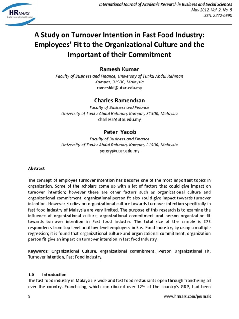 A Study On Turnover Intention In Fast Food Industry Employees Fit To The Organizational Culture And The Important Of Their Commitment Organizational Culture Turnover Employment