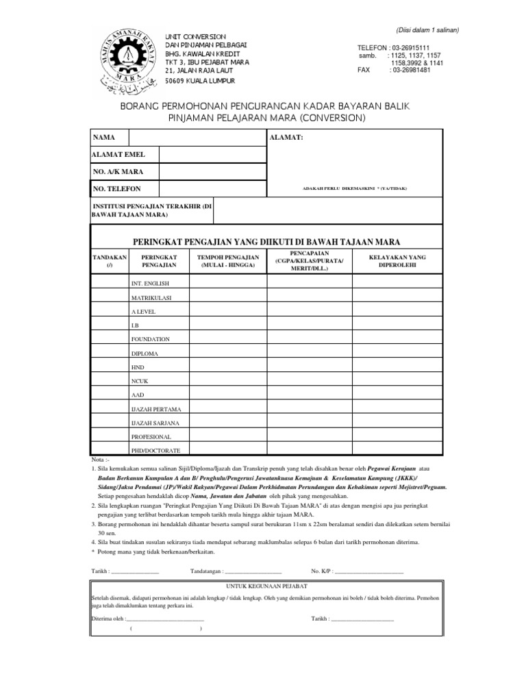 Borang Permohonan Pengurangan Kadar Bayaran Balik Pinjaman Pelajaran Mara Conversion