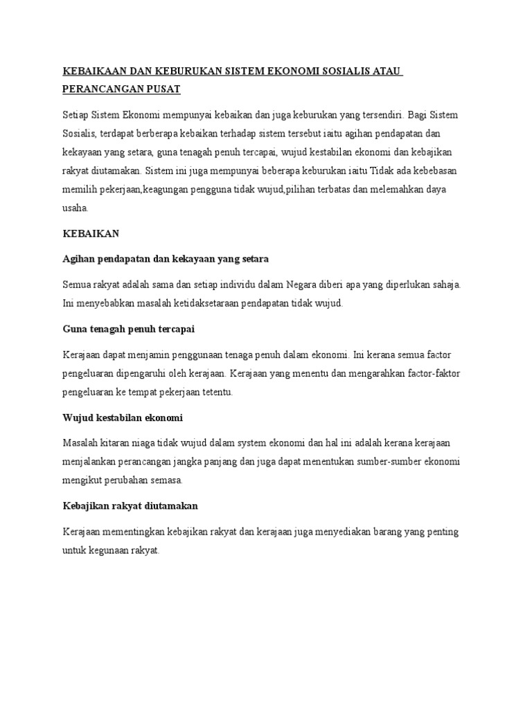Kebaikaan Dan Keburukan Sistem Ekonomi Sosialis Atau Perancangan Pusat