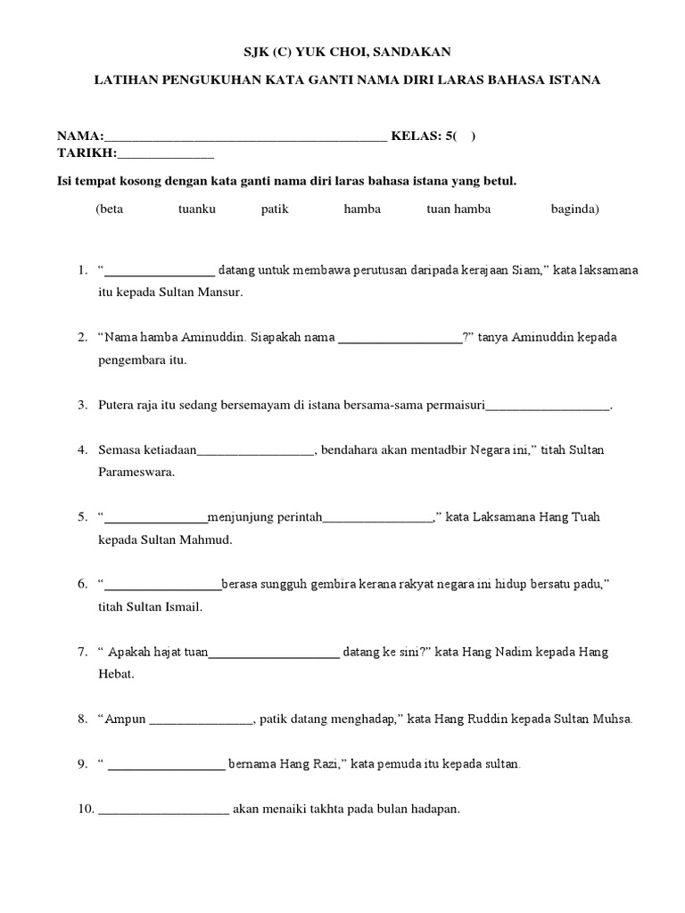 Latihan Kata Ganti Nama Diri Laras Istana T5