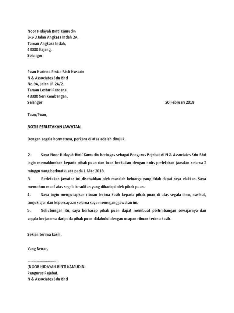 Contoh Surat Berhenti Kerja Surat Perletakan Jawatan
