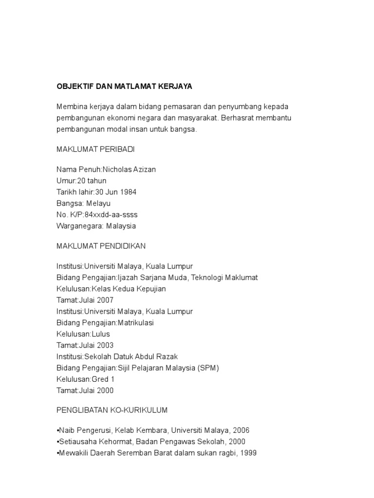 Objektif Matlamat Meningkatkan Dan Memajukan Diri Dalam Bidang Yang Diceburi Bagi Menjadikan Kerjaya Profession Resume Format Resume Sample Resume Format