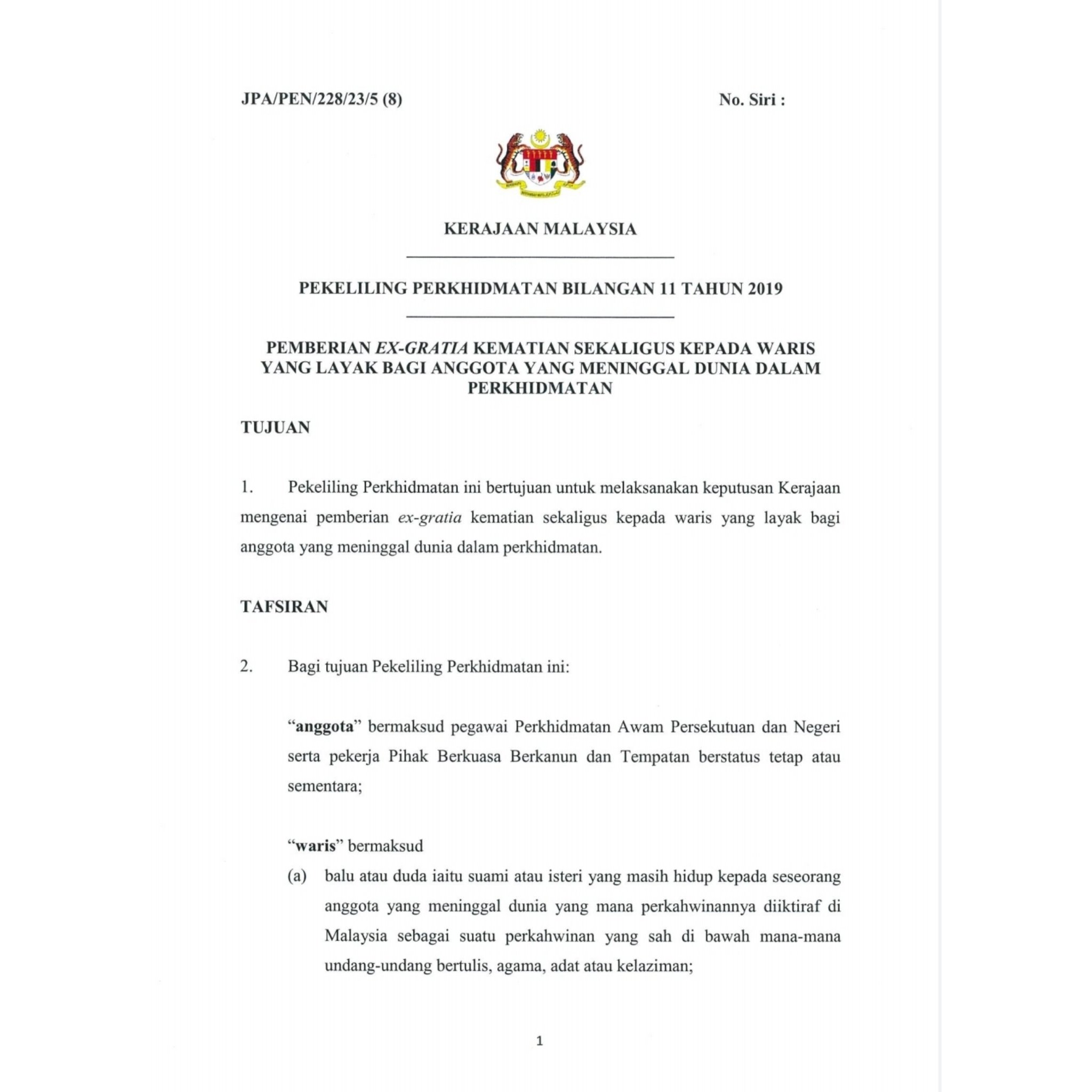 Jab Per Awam Jpa On Twitter Pekeliling Perkhidmatan Bilangan 11 Tahun 2019 Pemberian Ex Gratia Kematian Sekaligus Kepada Waris Yang Layak Bagi Anggota Yang Meninggal Dunia Dalam Perkhidmatan Pekeliling Berkuatkuasa Pd 1