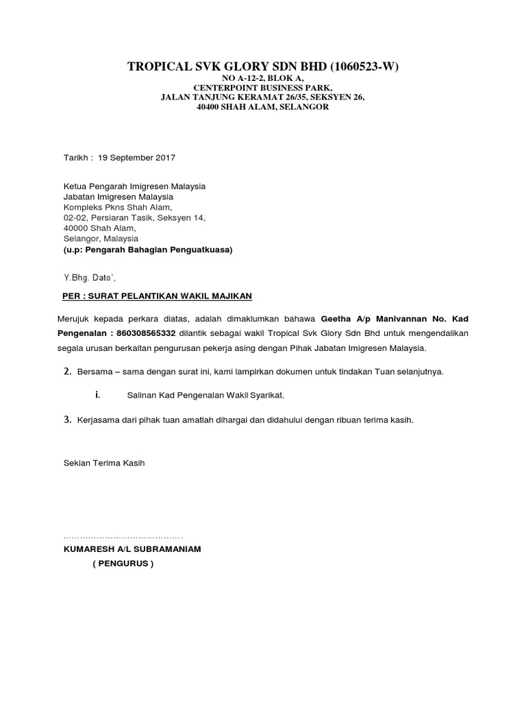 Surat Perlantikan Wakil Majikan